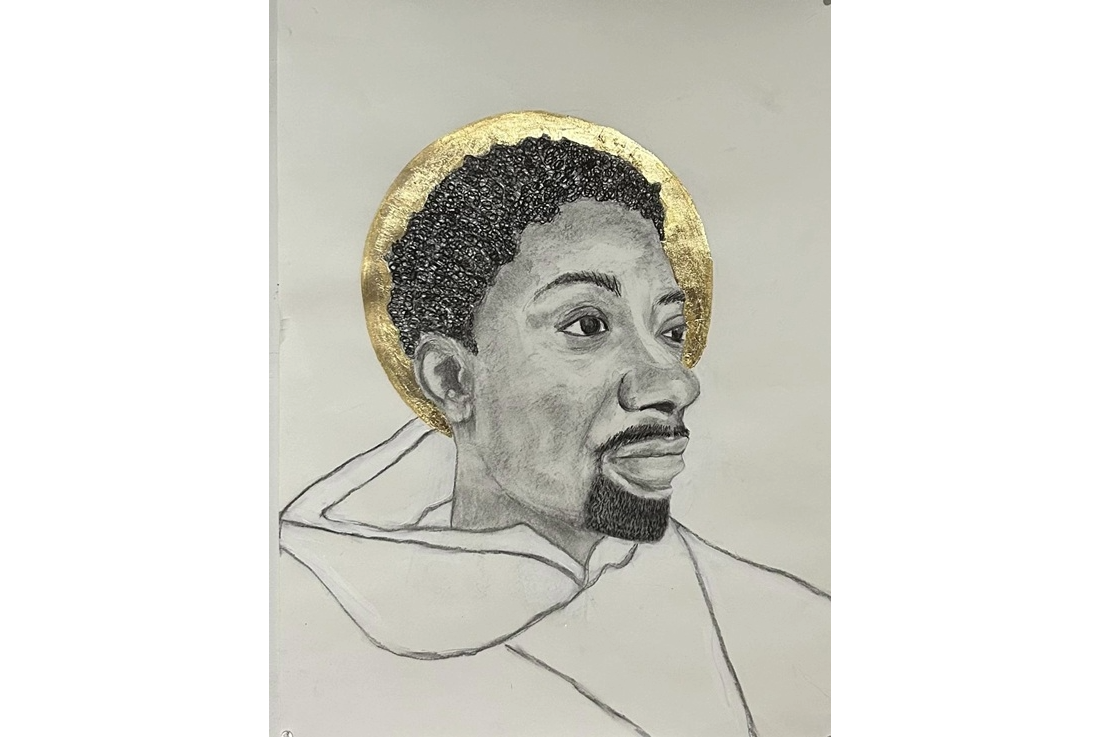 Jesus in a hoodie I am that I am Medium Charcoal on paper With gold leaf Dimensions 18 x 24 in. (Framed 30 x 36 in.) category God date January 1, 2025